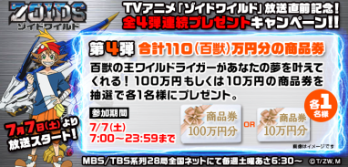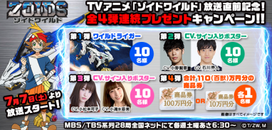 2018.10.26 「ゾイドワイルド」×「ファーストキッチン」タイアッププレゼントキャンペーン開催が決定! 2018.9.4 TVアニメ「ゾイドワイルド」!4弾連続早起きキャンペーン!!について 2018.7.23 コロツアー2018にゾイドワイルド出展決定! 2018.7.6 第1話放送を記念し、アニメ公式Twitterでキャンペーン開催! 2018.6.21 次世代ワールドホビーフェア’18Summer タカラトミーブースにゾイドワイルド出展! 2018.6.21 次世代ワールドホビーフェア’18Summer 第1話世界最速上映決定!! 2018.6.7 TVアニメ「ゾイドワイルド」放送直前記念!4弾連続プレゼントキャンペーンについて
